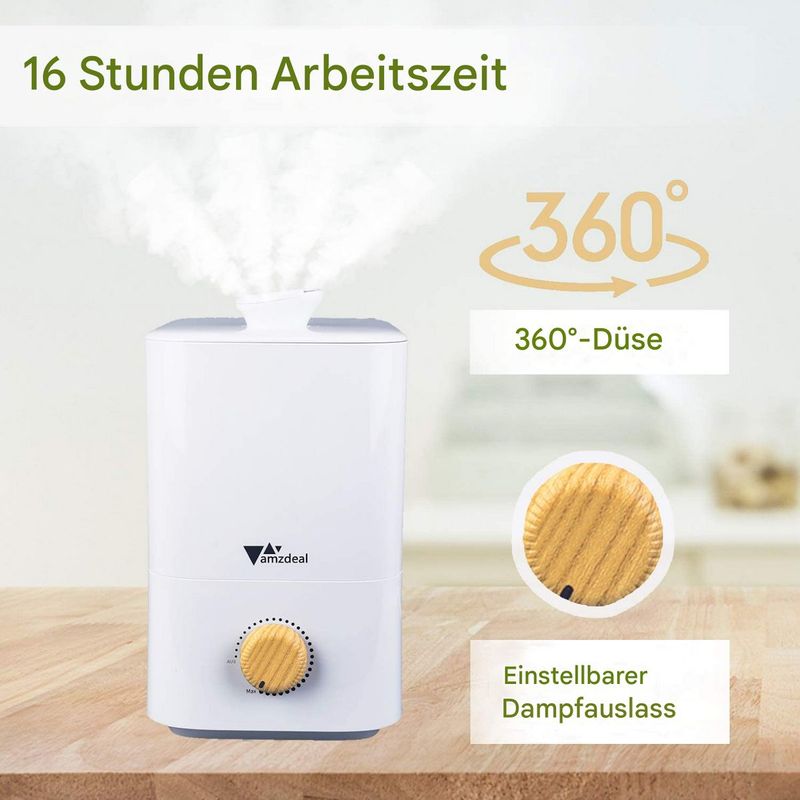 Ultraschall Luftbefeuchter der Marke Amzdeal. Der Luftbefeuchter hat eine Kapazität von 5 Liter. Dank des geringen Geräuschpegels von 28 dB wird niemand gestört. Der 360° Auslass sorgt dafür, dass die Dampfrichtung selbst eingestellt werden kann. Der Luftbefeuchter arbeitet bis zu 16 Stunden. Die maximale Leistung beträgt bis zu 386 ml/h. Bei Wassermangel schaltet sich das Gerät automatisch aus.