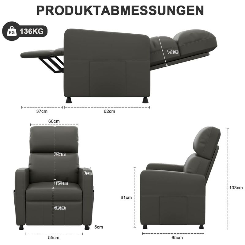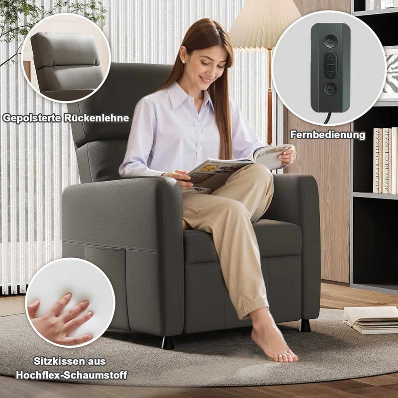 Dieser elektrische TV-Sessel der Marke Devoko bietet erstklassigen Komfort für stundenlange Entspannung. Die Kombination aus hochdichter Schaumstoffpolsterung und integrierter Wellenfeder-Technologie sorgt für optimale Druckentlastung und eine elastische Unterstützung von Kopf bis Fuß. Rückenlehne und Fußteil lassen sich per Fernbedienung stufenlos von 90° bis 155° verstellen – perfekt für Lesen, Fernsehen, Gaming oder ein kurzes Nickerchen. Mit nur einem Knopfdruck wechseln Sie vom Sitzen in den Relaxmodus und genießen individuell einstellbaren Komfort. Der wasserabweisende PVC-Bezug in elegantem Dunkelgrau ist pflegeleicht und lässt sich einfach abwischen, während das zeitlose Design in jedes Wohn-, Arbeits- oder Gästezimmer passt. Vier robuste Standfüße verleihen zusätzliche Stabilität und schützen den Boden beim Umstellen des Sessels. Ein vielseitiger Relaxsessel, der Luxus und Alltagstauglichkeit ideal verbindet – auch als Geschenk für Ihre Liebsten eine hervorragende Wahl.