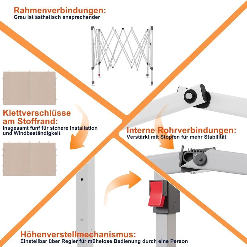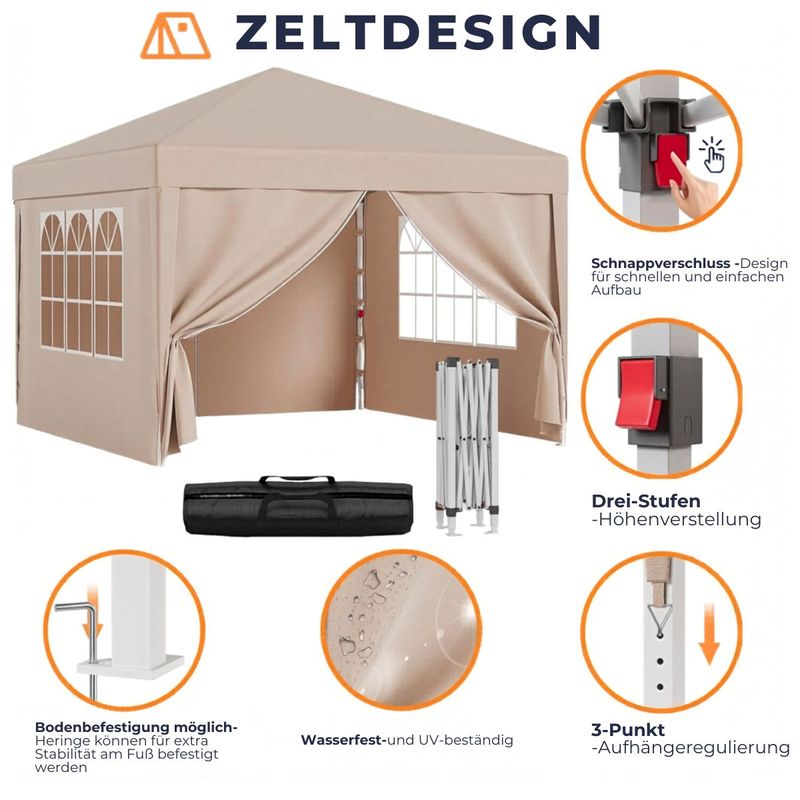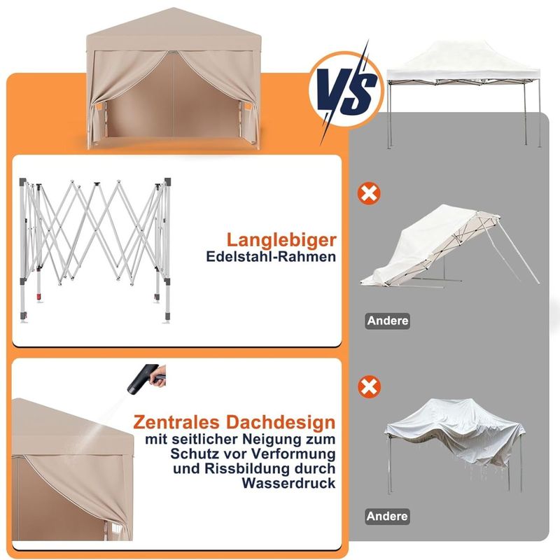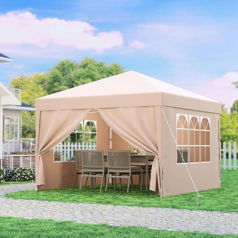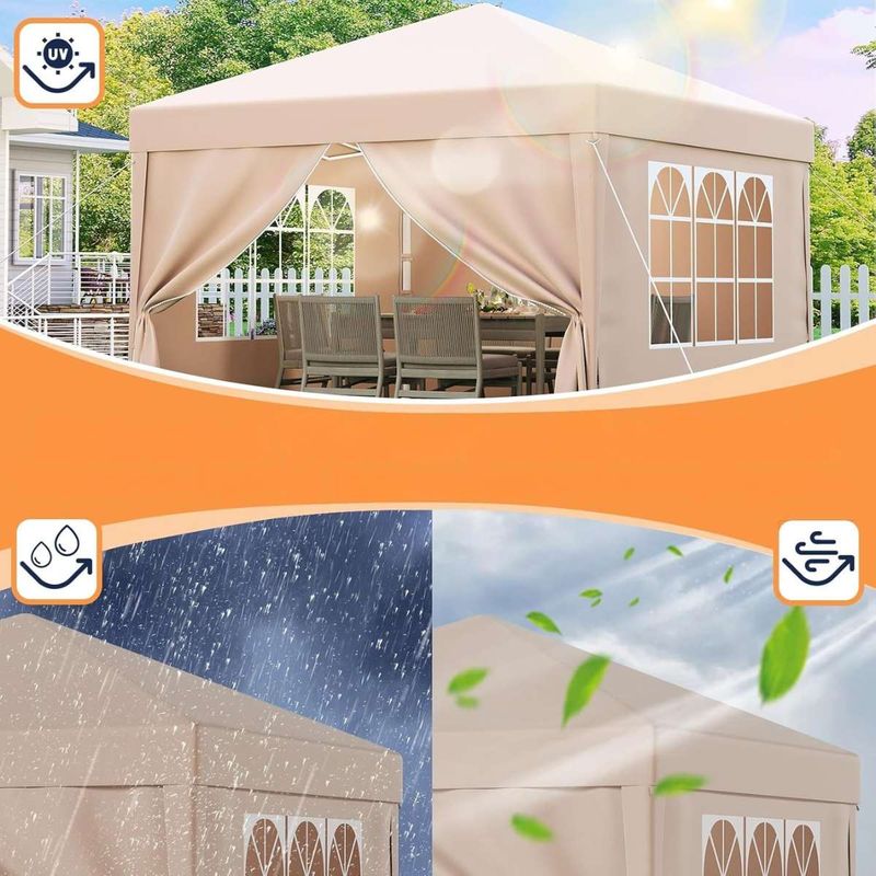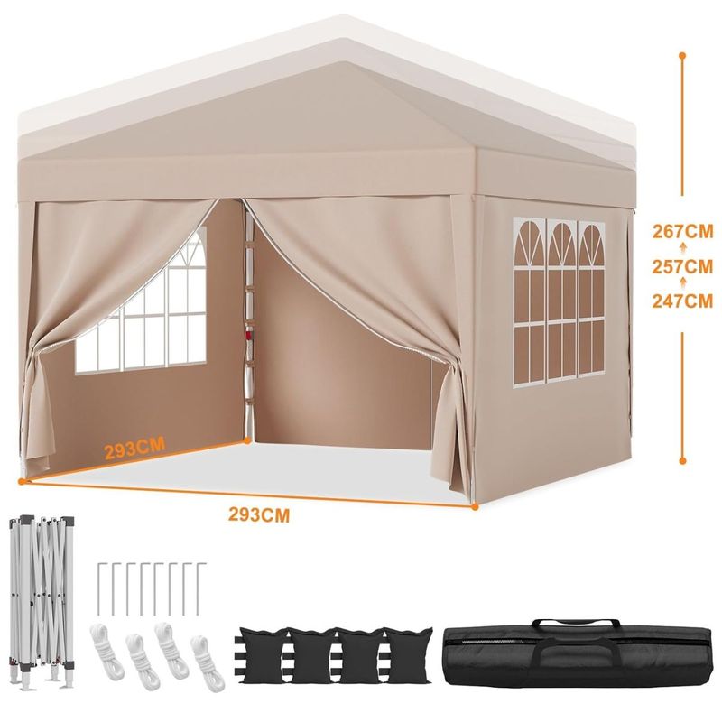 Dieser faltbare Pavillon mit einer Größe von 3 x 3 m bietet Ihnen zuverlässigen Schutz bei verschiedensten Outdoor-Anlässen. Das Dach aus hochwertigem 210D Oxford-Gewebe mit PVC-Beschichtung ist wasserfest und verfügt über einen UV-Schutz von 50+, sodass Sie und Ihre Gäste optimal vor Sonne und Regen geschützt sind. Die flexibel abnehmbaren Seitenwände sind ebenfalls wasserfest beschichtet. Das stabile Metallgestell ist rostbeständig und sorgt in Kombination mit den mitgelieferten Metallheringen und Spannseilen für einen sicheren Stand. Dank des durchdachten Faltmechanismus lässt sich der Pavillon werkzeuglos und in wenigen Minuten aufbauen. Mit einem geringen Gewicht sowie der stabileren Tragetasche ist er zudem leicht zu transportieren und flexibel einsetzbar. Die dreifach verstellbare Höhe ermöglicht eine individuelle Anpassung an den Anlass. Ob für Gartenfeste, Märkte oder Camping – dieser Pavillon ist eine praktische und vielseitige Lösung für den Außenbereich.