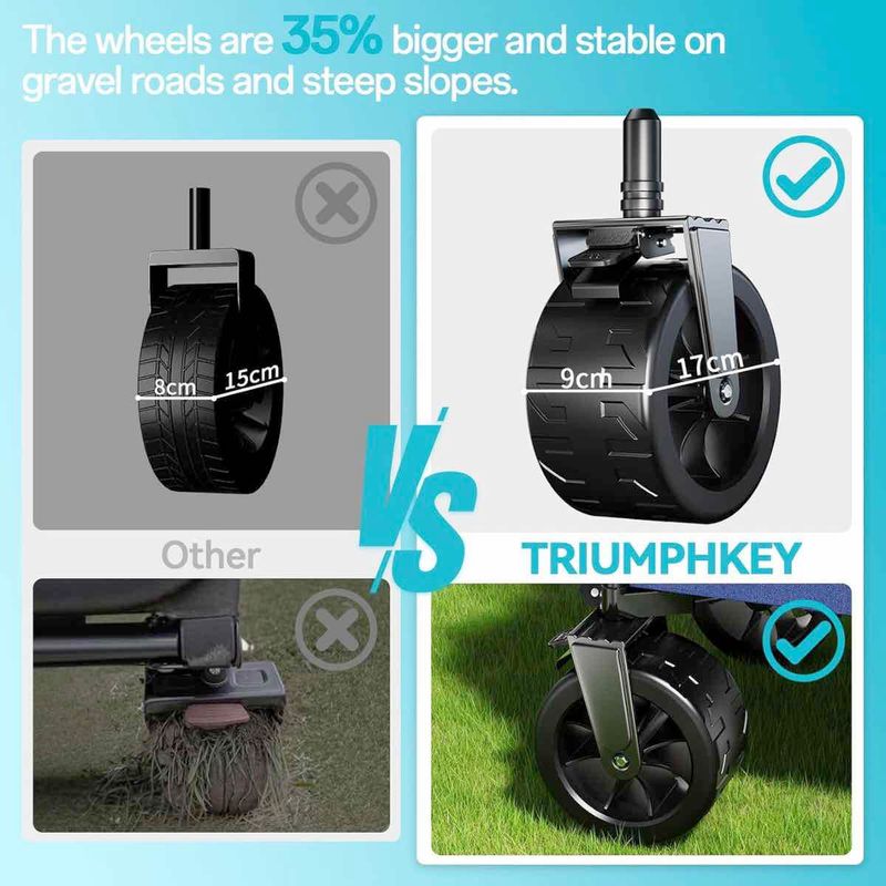 Zum Verstauen von kleineren Dingen hat der Bollerwagen große Netztaschen und zusätzlich 2 Getränkehalter. Dank der 17cm, robusten PU-Geländereifen kann der Wagen auch auf unebenen Flächen mühelos gezogen werden. Die Spurstange lässt sich für optimalen Zug leicht ausziehen und flexibel im Winkel verstellen.