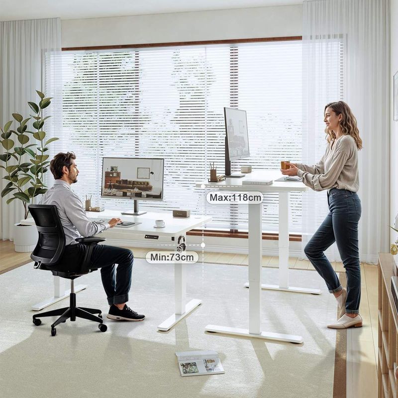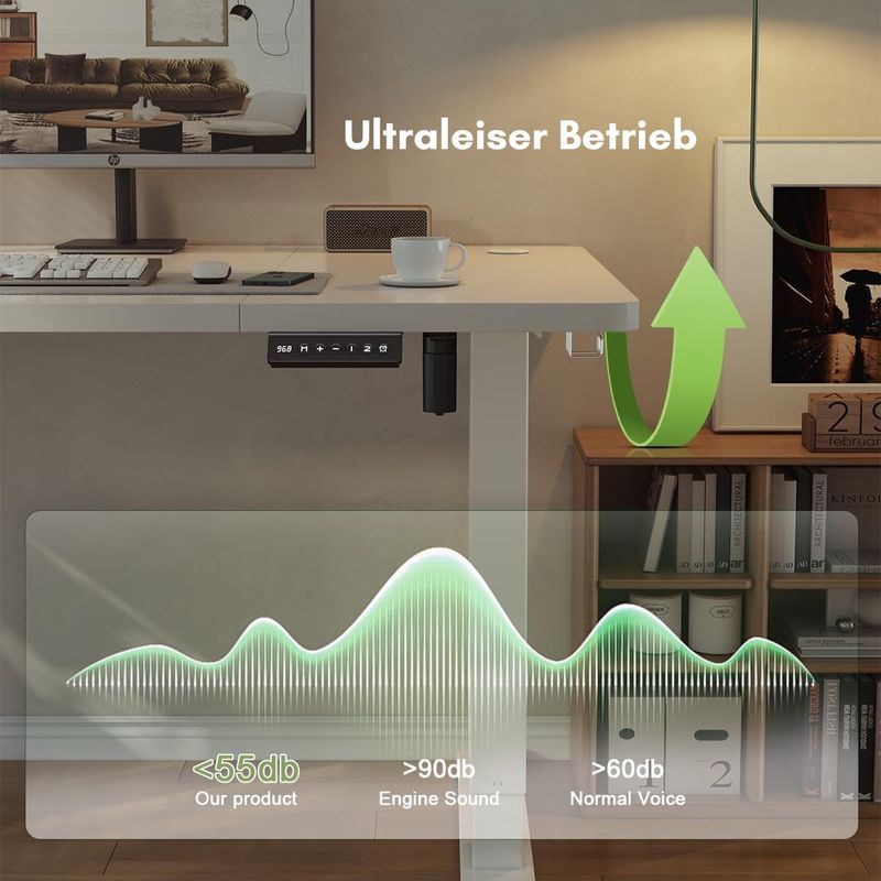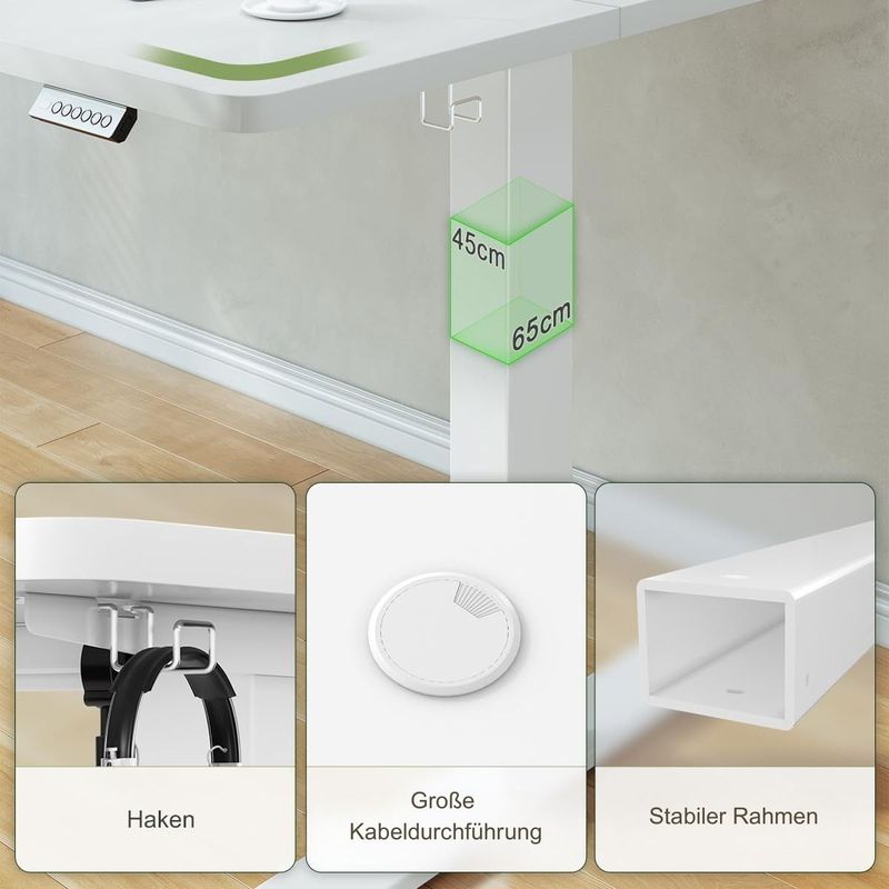 Dieser höhenverstellbare Schreibtisch kombiniert modernes Design mit ergonomischen Funktionen. Das Stehpult lässt sich ca. 73-118 cm in der Höhe verstellen und ermöglicht somit einfachen Wechsel zwischen Sitz- und Stehposition, um Rücken- und Nackenprobleme zu lindern, Konzentration zu fördern und Ermüdung zu reduzieren. Darüber hinaus ist das Bedienpanel mit einer USB-Ladebuchse ausgestattet und verfügt über eine Memory-Funktion, um sich zwei Höhen zu merken. Ein Alarm erinnert Sie an das regelmäßige Wechseln der Position, während der praktische Haken zusätzlichen Komfort bietet. Der Computertisch verfügt über stabile Beine mit einer Tragfähigkeit von bis zu 70 kg, während der leise Motor mit weniger als 50 dB arbeitet.