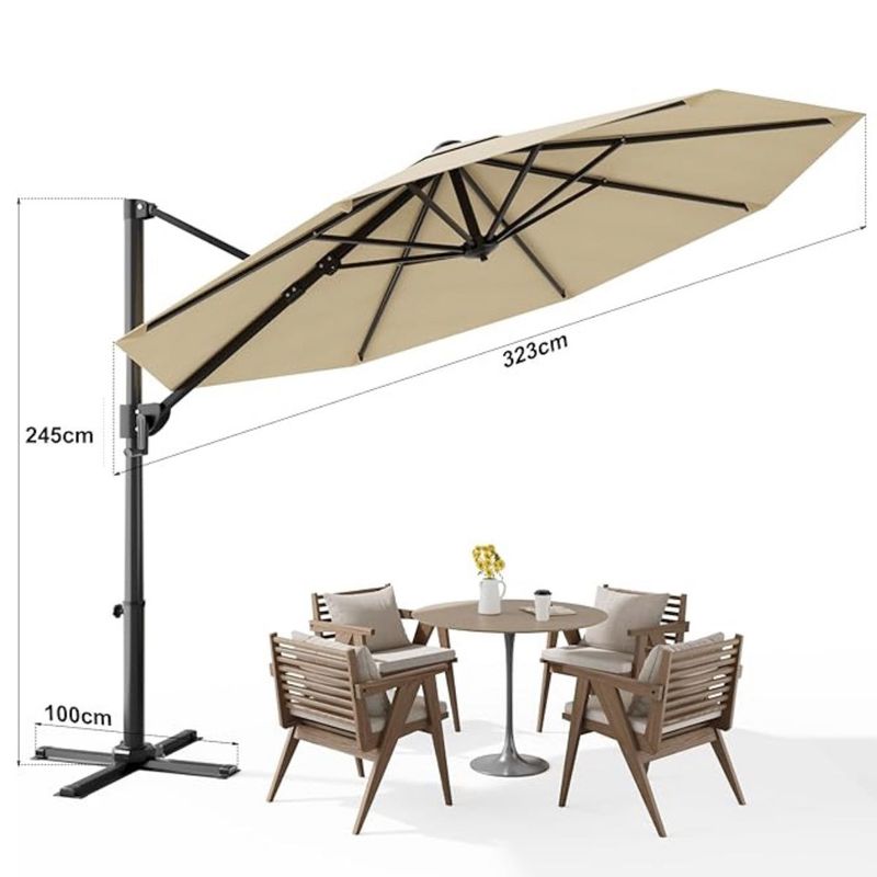 Der 8-eckige Sonnenschirm mit einem Durchmesser von ca. 323 cm bietet großzügigen Schatten und zuverlässigen Schutz bei Sonne und Regen.