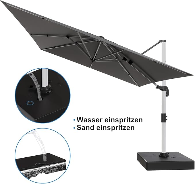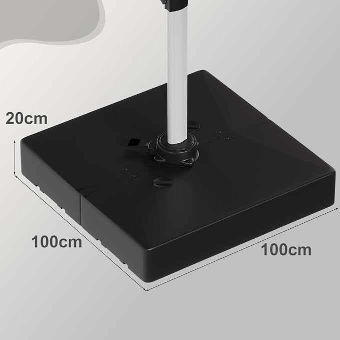 Der Schirmständer der Marke Devoko überzeugt durch sein schlichtes Design und seine hervorragende Stabilität. Der Schirmständer kann alternativ mit Wasser oder Sand befüllt werden. Ist der Schirmständer mit Wasser befüllt, wiegt er ca. 160 kg. Mit Sand und Wasser befüllt beträgt das Gesamtgewicht bis zu ca. 208 kg.
