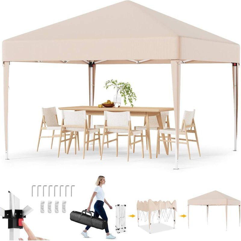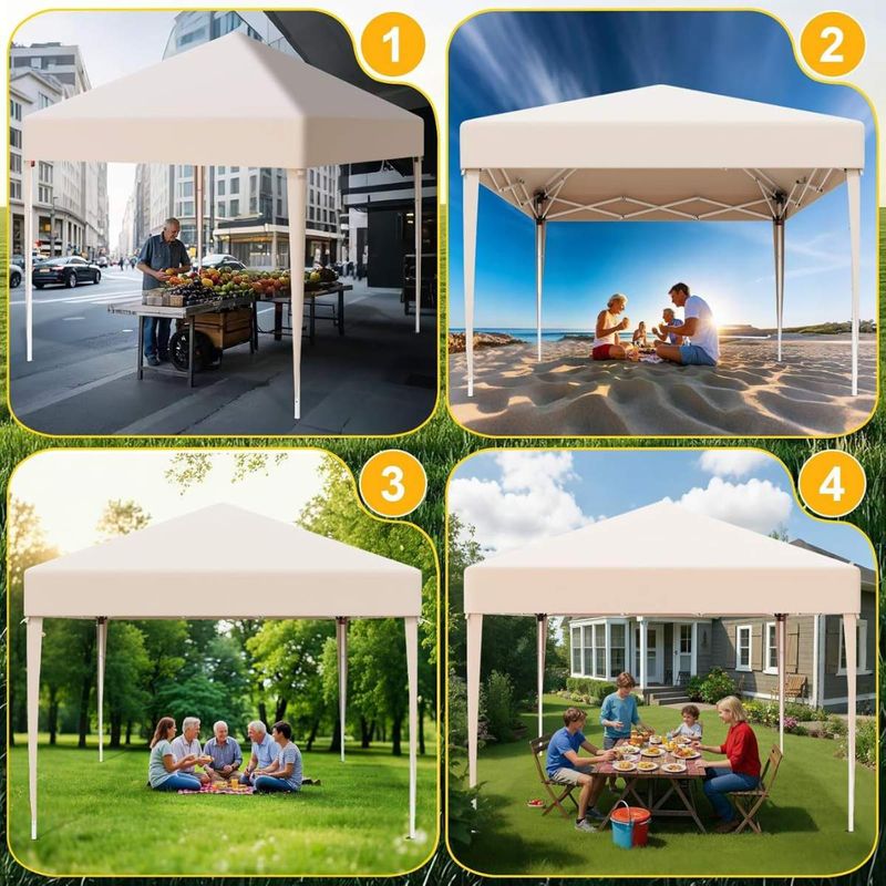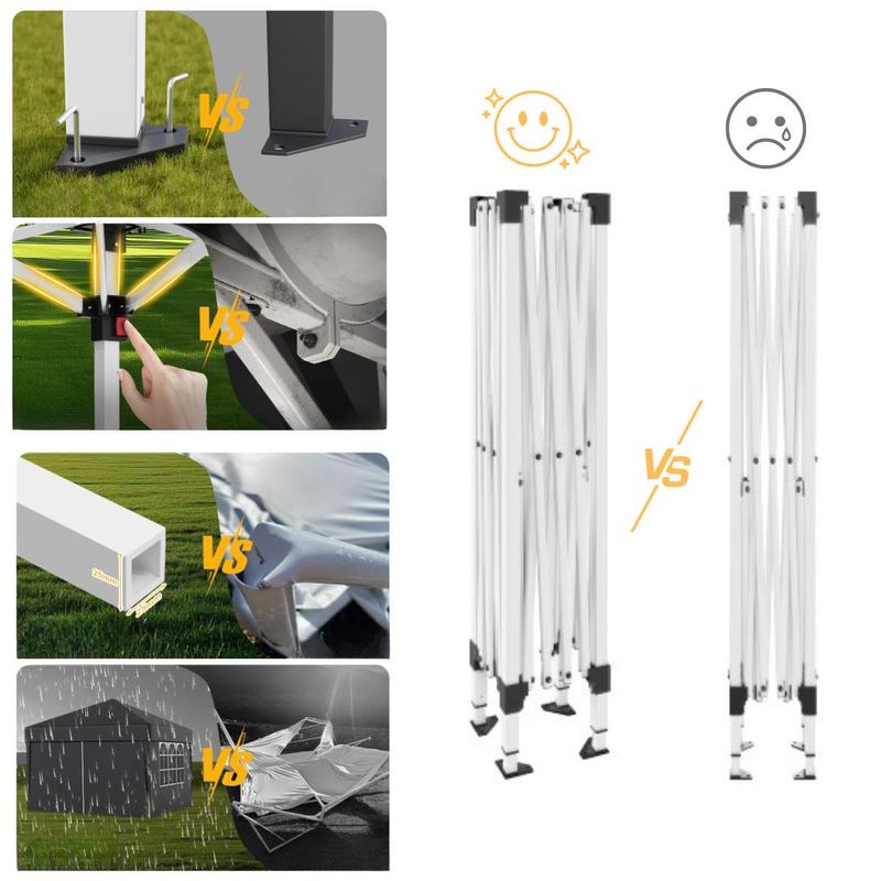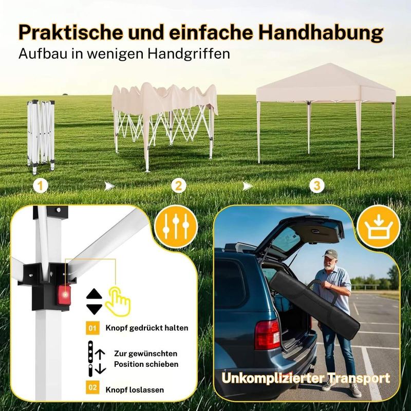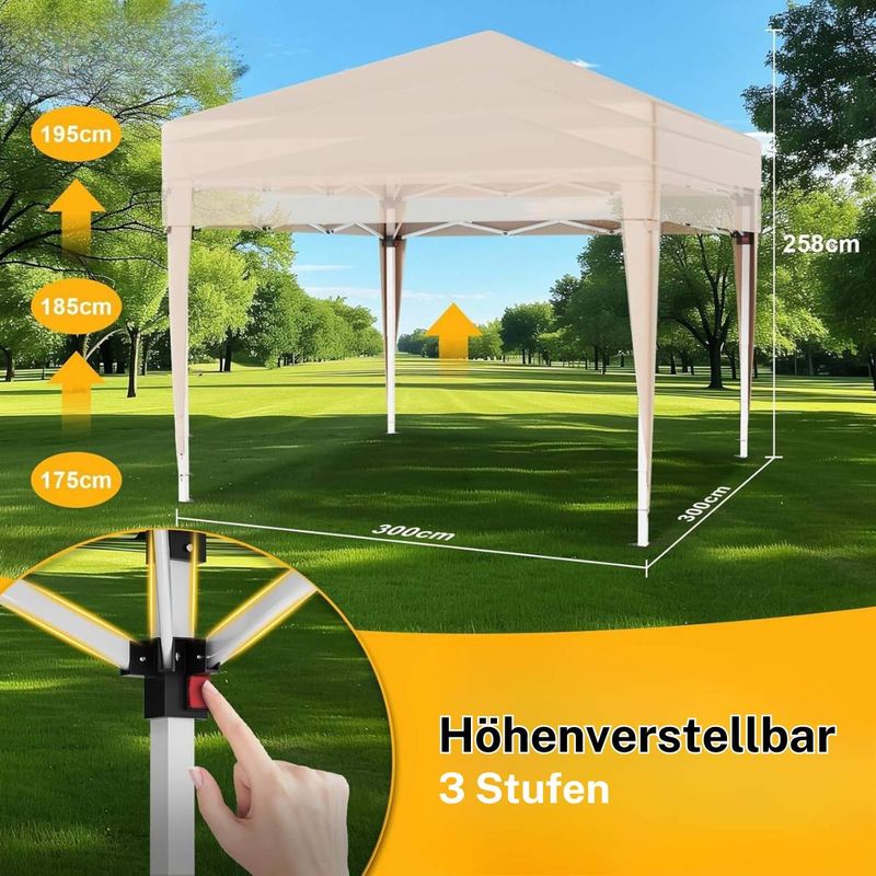 Dieser faltbare Pavillon mit einer Größe von 3 x 3 m bietet Ihnen zuverlässigen Schutz bei verschiedensten Outdoor-Anlässen. Das Dach aus hochwertigem 210D Oxford-Gewebe mit PVC-Beschichtung ist wasserfest und verfügt über einen UV-Schutz von 50+, sodass Sie und Ihre Gäste optimal vor Sonne und Regen geschützt sind. Das stabile Metallgestell ist rostbeständig und sorgt in Kombination mit den mitgelieferten Metallheringen und Spannseilen für einen sicheren Stand. Dank des durchdachten Faltmechanismus lässt sich der Pavillon werkzeuglos und in wenigen Minuten aufbauen. Mit einem geringen Gewicht sowie der praktischen und stabilen Tragetasche ist er zudem leicht zu transportieren und flexibel einsetzbar. Die dreifach verstellbare Höhe ermöglicht eine individuelle Anpassung an den Anlass. Ob für Gartenfeste, Märkte oder Camping – dieser Pavillon ist eine praktische und vielseitige Lösung für den Außenbereich.