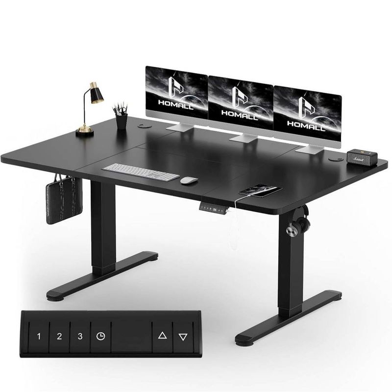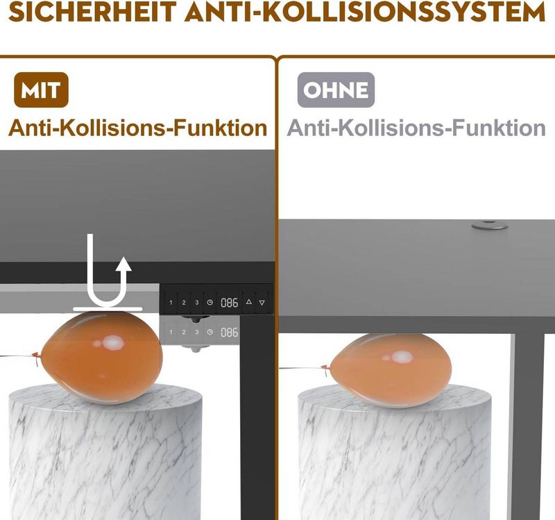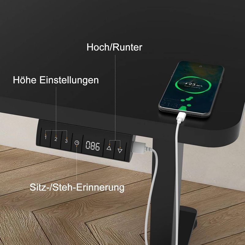 Der elektrisch höhenverstellbare Schreibtisch ermöglicht einen gesunden Wechsel zwischen Sitzen und Stehen. Mit einer Tischgröße von 160x80 cm und einer Tragfähigkeit von bis zu 70 kg bietet der Schreibtisch Flexibilität für jeden Bedarf. Das integrierte LCD-Panel ermöglicht die Höhenverstellung zwischen 72-118 cm und verfügt zusätzlich über drei programmierbare Höhenvoreinstellungen, um Ihre favorisierte Tischhöhe zu speichern. Mit dem praktischen USB-Ladeanschluss können Sie Ihre smarten Geräte jederzeit aufladen. Dank der stabilen Doppelträger-Konstruktion und der verbesserten Sensor-Technologie, ist die Sicherheit ebenfalls gewährleistet. Der geräuscharme Betrieb bei <55 dB und der geringe Stromverbrauch im Standby-Modus machen den Schreibtisch zusätzlich effizient und alltagstauglich. Mit diesem höhenverstellbaren Schreibtisch wird nicht nur die Durchblutung gefördert, sondern auch Ihr Rücken und Nacken an langen Arbeitstagen entlastet. Die praktischen Haken beiten eine Aufhängungsmöglichkeit für Kopfhörer oder Taschen und Dank der Kabeldurchführungen können Sie Kabelchaos effektiv verhindern.
