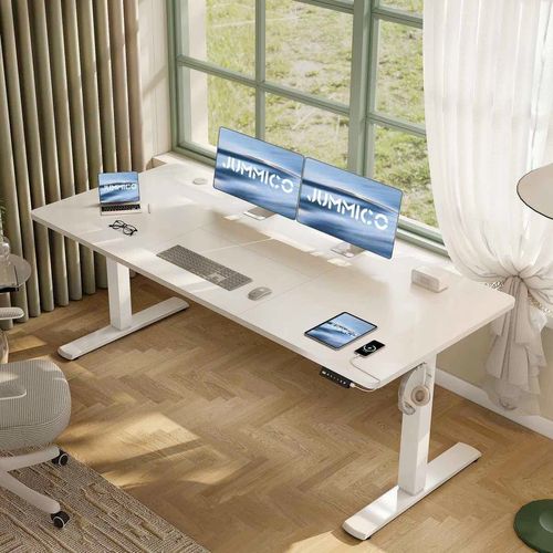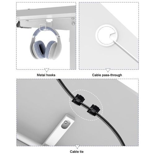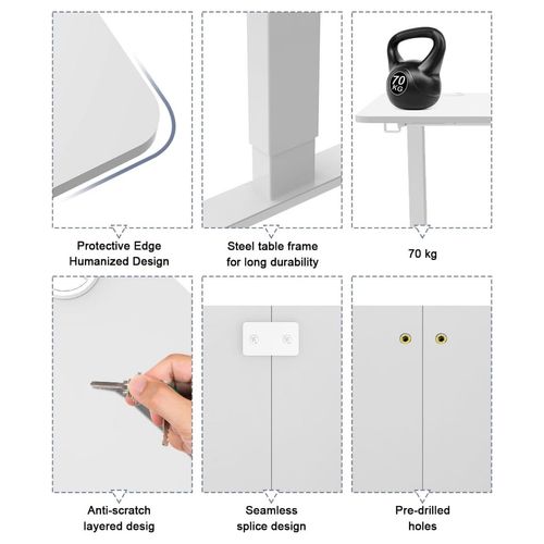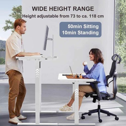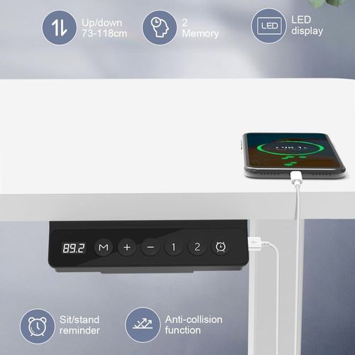 Dieser höhenverstellbare Schreibtisch kombiniert modernes Design mit ergonomischen Funktionen. Der Stehpult lässt sich ca. 73-118 cm in der Höhe verstellen und ermöglicht somit einfachen Wechsel zwischen Sitz- und Stehpositionen, um Rücken- und Nackenprobleme zu lindern, die Konzentration zu fördern und die Ermüdung zu reduzieren. Darüber hinaus ist das Bedienpanel mit einer USB-Ladebuchse ausgestattet und verfügt über eine Memory-Funktion, um sich zwei Höhe zu merken. Ein Alarm erinnert Sie das regelmäßige Wechseln der Position, während der praktische Haken zusätzlichen Komfort bietet. Der Computertisch verfügt über stabile Beine mit einer Tragfähigkeit von bis zu 60 kg, während der leise Motor mit weniger als 50 dB arbeitet.