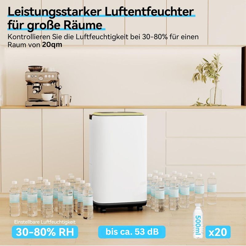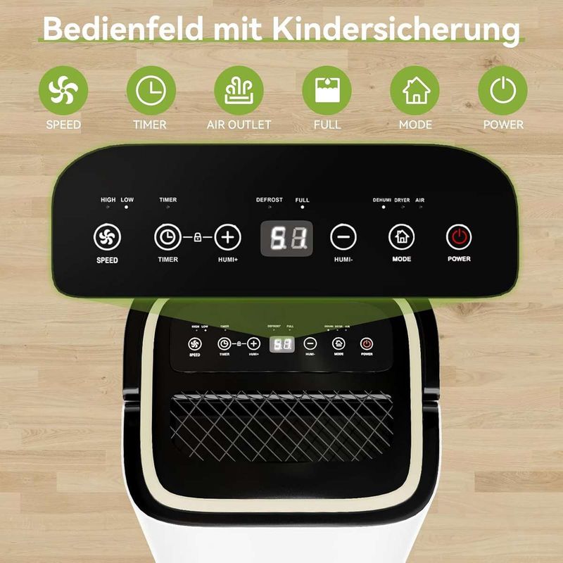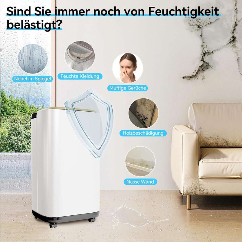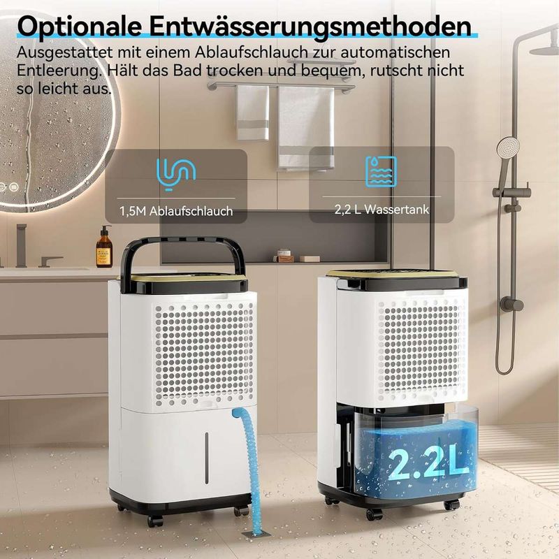 Dieser kompakte Luftentfeuchter sorgt für ein angenehm trockenes Raumklima und schützt Ihr Zuhause zuverlässig vor Feuchtigkeit, Schimmel und muffigen Gerüchen. Mit einer Entfeuchtungsleistung von bis zu 10 Litern pro Tag ist das Gerät ideal für Räume bis 20 m², wie Schlafzimmer, Keller oder Büros. Der 2,2 Liter große Wassertank lässt sich leicht entnehmen und entleeren, während das Gerät bei vollem Tank automatisch abschaltet. Alternativ kann ein Schlauch an den Luftbefeuchter angeschlossen werden, um das Wasser direkt in einen Abfluss zu leiten. Der leistungsstarke 185 W-Motor arbeitet energieeffizient und erreicht einen Geräuschpegel von nur ca. 53 dB, sodass der Entfeuchter auch im Alltag angenehm leise bleibt. Der Arbeitsbereich von 30–80 % relativer Luftfeuchtigkeit (RH) sorgt für eine präzise Feuchtigkeitsregulierung – perfekt abgestimmt auf wechselnde Raumverhältnisse. Dank des umweltfreundlichen Kältemittels R290 arbeitet das Gerät klimafreundlich und effizient. Mit kompakten Maßen von ca. 25,5 × 22 × 46 cm und einem Leergewicht von nur ca. 9 kg lässt sich der Entfeuchter bequem transportieren und flexibel aufstellen. Ideal für alle, die Komfort, Leistung und Umweltbewusstsein in einem Gerät vereinen möchten.