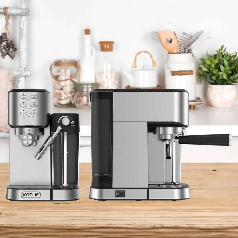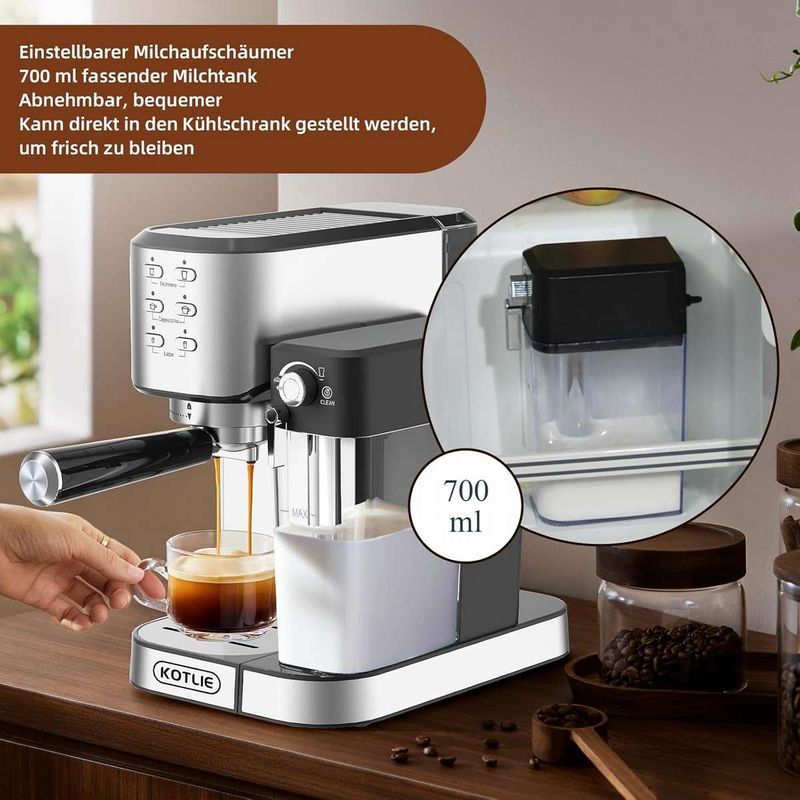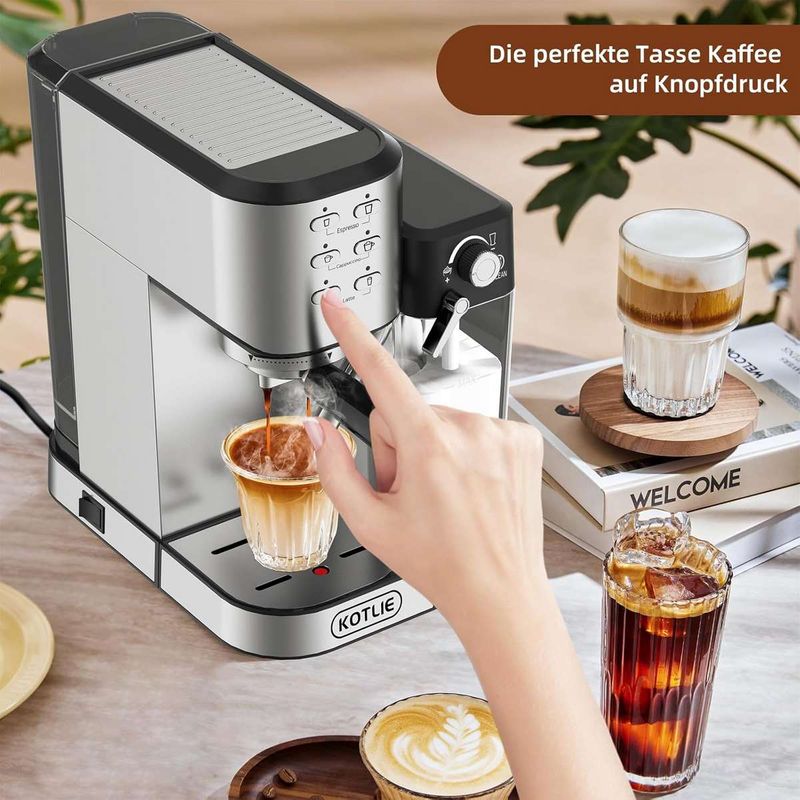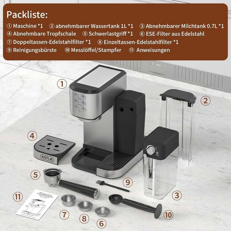 Diese elegante Espressomaschine mit Siebträger vereint stilvolles Design mit vielseitiger Kaffeekompetenz – perfekt für jeden, der echten Kaffeegenuss liebt. Ob Espresso, Doppio, Cappuccino, doppelter Cappuccino, Milchkaffee oder doppelter Milchkaffee – mit nur wenigen Handgriffen zaubert sie aromatische Kaffeespezialitäten ganz nach Geschmack. Der Drehknopf zur Milchschaumsteuerung ermöglicht cremigen Schaum in der gewünschten Stärke – ideal für Latte Art oder Cappuccino-Liebhaber. Dank der kompatiblen Brühgruppe für gemahlenen Kaffee oder 44-mm-E.S.E.-Pads genießen Sie maximale Flexibilität. Der abnehmbare Milchbehälter, die Tropfschale und der Wassertank erleichtern Reinigung und Nachfüllen, während die Auto-Abschaltung nach 25 Minuten für Sicherheit und Energieeffizienz sorgt. Das hochwertige Gehäuse mit edler Oberfläche fügt sich harmonisch in jede Küche ein und macht schon beim Anblick Lust auf Kaffee. Eine Maschine, die Funktionalität, Design und Genuss perfekt verbindet – für den täglichen Barista-Moment zu Hause.