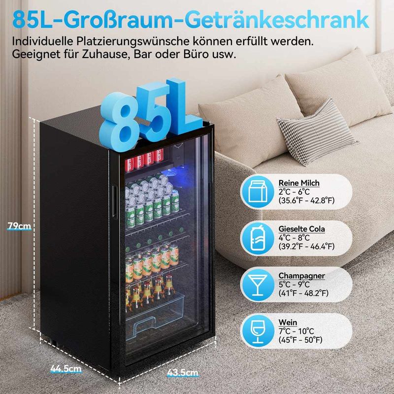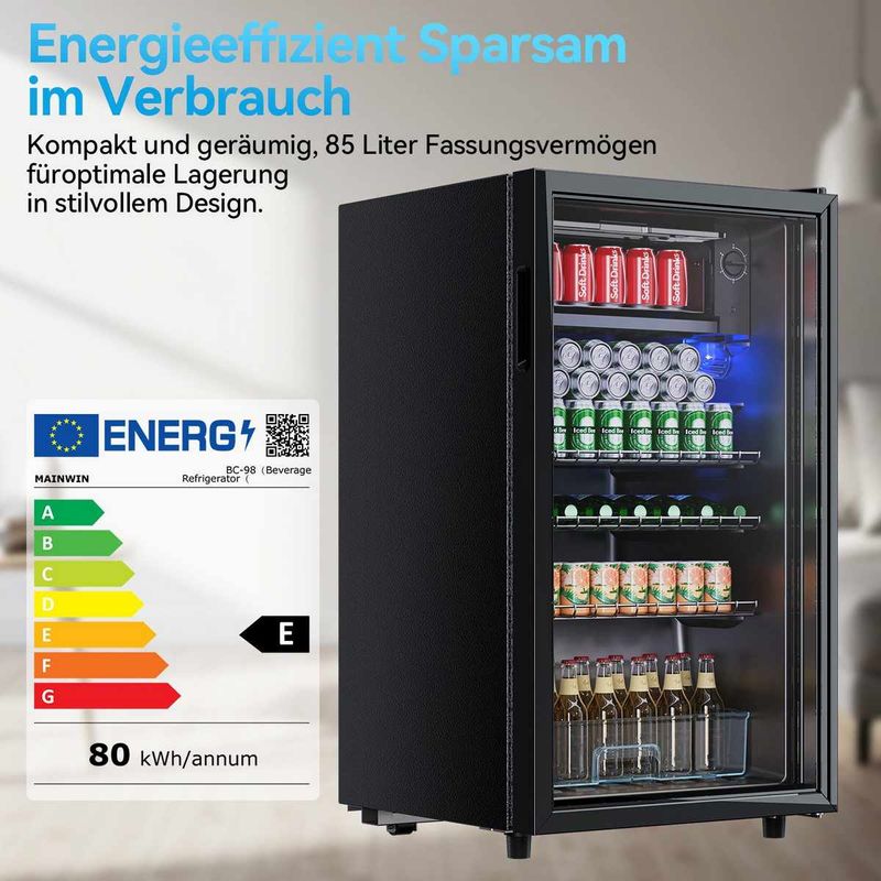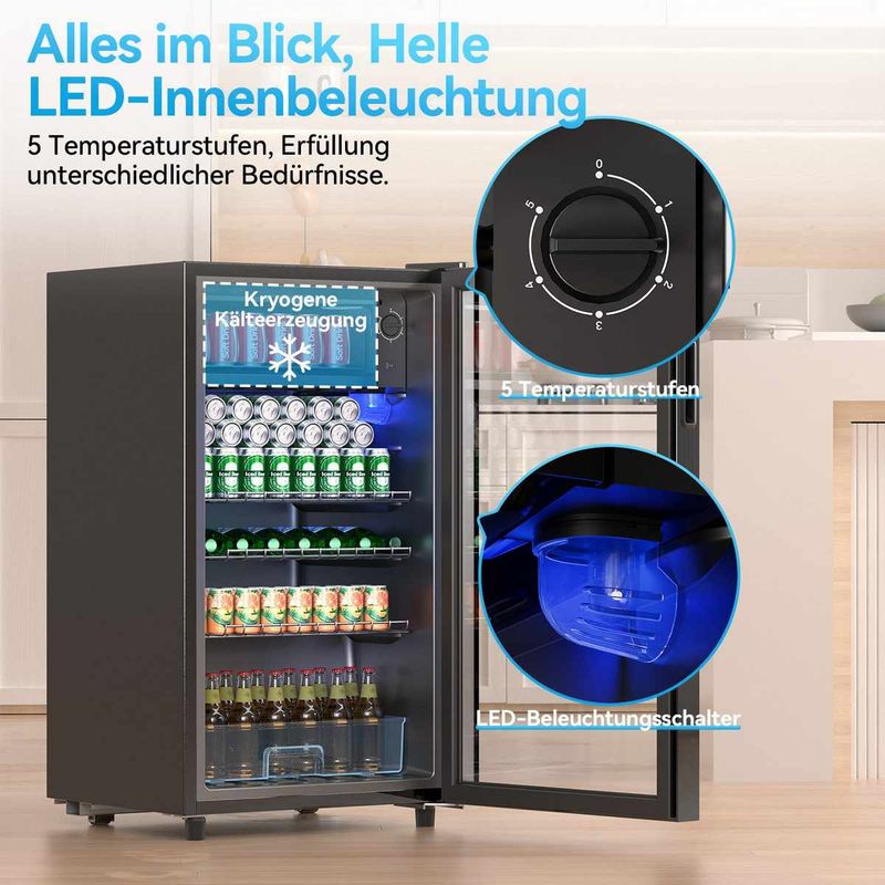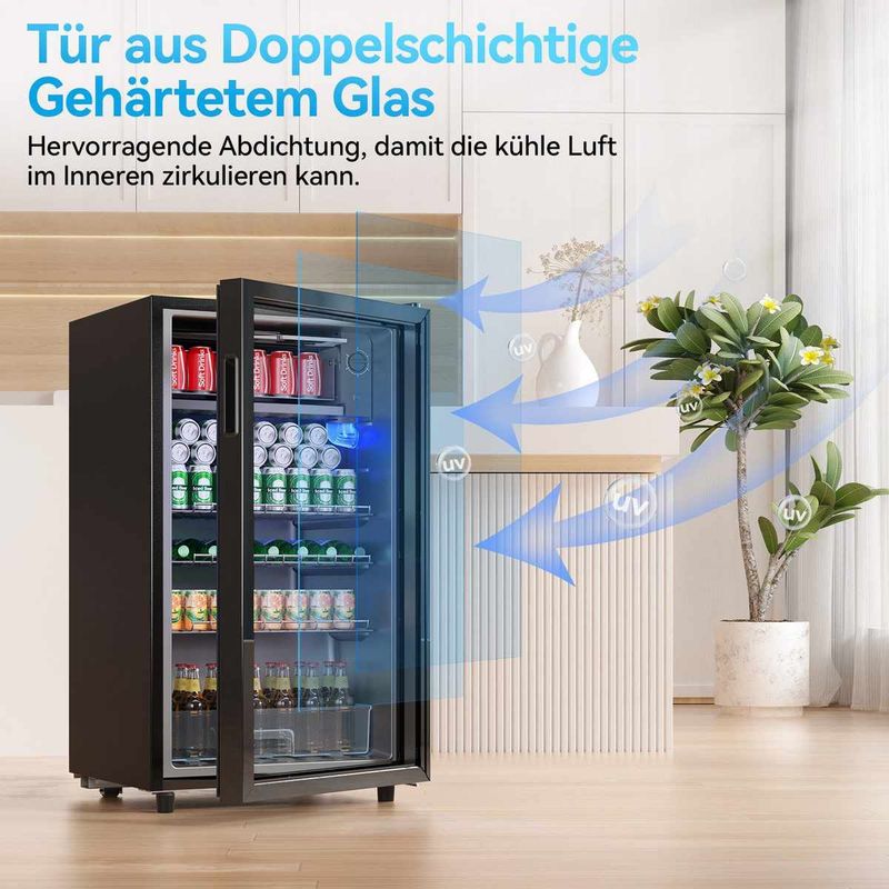 Dieser moderne Getränkekühlschrank kombiniert kompaktes Design mit großzügigen 85 Litern Fassungsvermögen – perfekt zur stilvollen Lagerung Ihrer Lieblingsgetränke. Dank doppelwandiger Glastür aus gehärtetem Glas bleibt die Kälte im Inneren zuverlässig erhalten, während LED-Innenbeleuchtung für klare Sicht auch bei Nacht sorgt. Das leistungsstarke Kühlsystem verteilt die Kälte schnell und gleichmäßig, und mit 5 Temperaturstufen passen Sie die Kühlung optimal an unterschiedliche Getränke an.