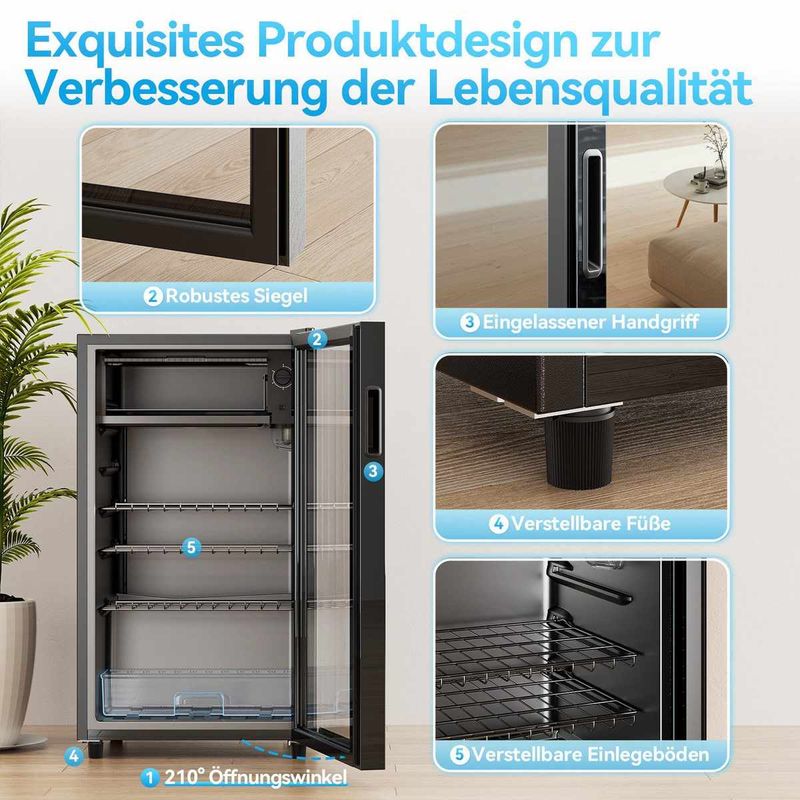 Besonderheiten: 5 Temperaturstufen, 3 verstellbare Regalböden, LED-Beleuchtung, große Kapazität trotz kompakter Maße, geräuscharm, gehärtete Glastür (doppelwandig)