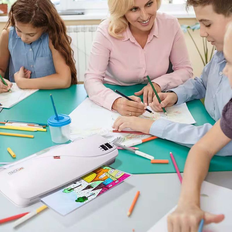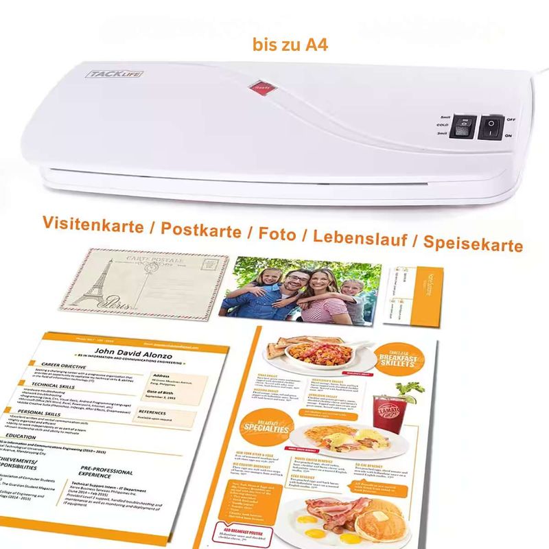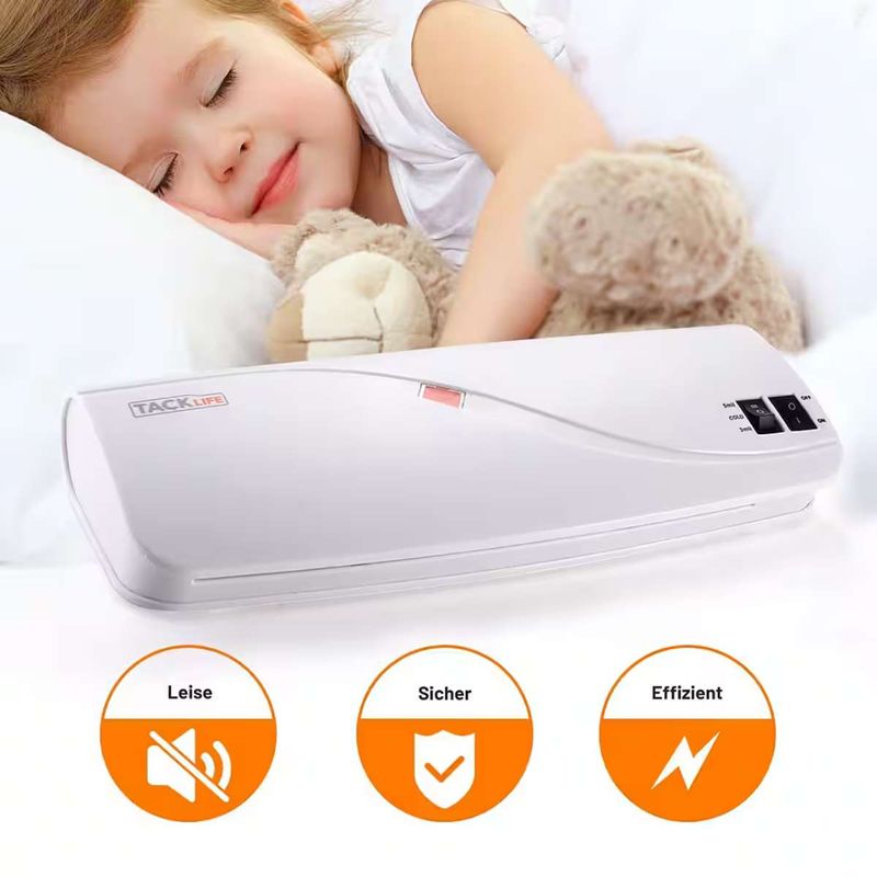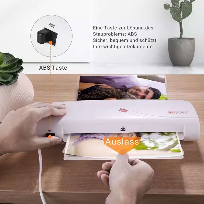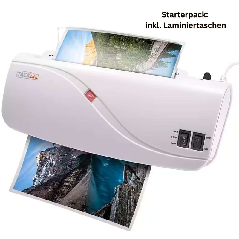 Dieses kompakte Laminiergerät der Marke Tacklife ist der ideale Helfer für Ihr Zuhause, die Schule oder Ihr Geschäft. Ob wichtige Dokumente, Fotos, Bastelarbeiten, Visitenkarten oder Speisekarten– mit Kalt- und Heißlaminierfunktion sind Ihre Unterlagen zuverlässig geschützt. Das Gerät verarbeitet Folien bis A4-Größe und unterstützt maximal 200 Mikron bei Kaltlaminierfolien sowie 80–125 Mikron bei Heißlaminierfolien. Mit einer Geschwindigkeit von ca. 260 mm/min ist ein A4-Dokument bereits in etwa 30 Sekunden laminiert. Für extra Sicherheit sorgt der praktische ABS-Schalter, mit dem sich ein Papierstau einfach beheben lässt. Dank des schnellen Aufheizens in durchschnittlich 3 Minuten und der unkomplizierten Bedienung ist das Laminieren jederzeit stressfrei möglich. Als praktisches Starter-Set sind bereits 10 Laminierfolien im Lieferumfang enthalten – direkt einsatzbereit ab dem ersten Tag.