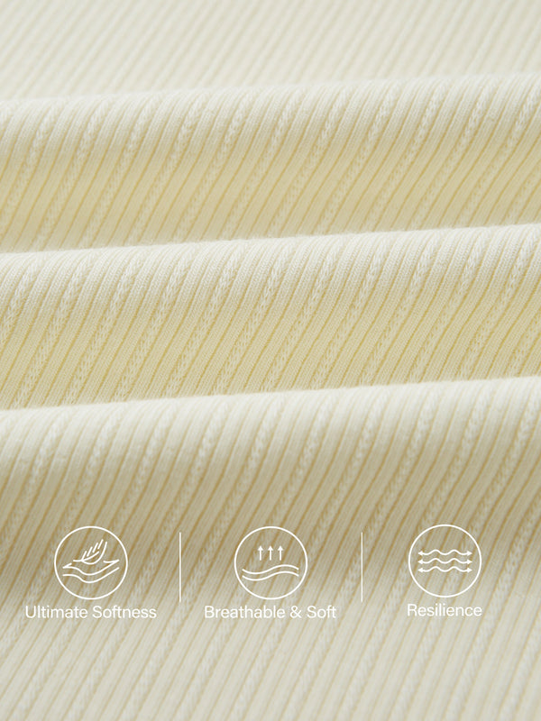 Ein leichter Strickstoff aus Baumwolle, Modal und Elasthan. Er fühlt sich weich an und ist atmungsaktiv. Die zarte Pointelle-Textur verleiht dem Kleidungsstück eine subtile Dimension und verbessert gleichzeitig die Luftzirkulation. So ist es perfekt für den Sommer.