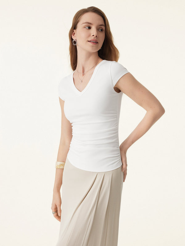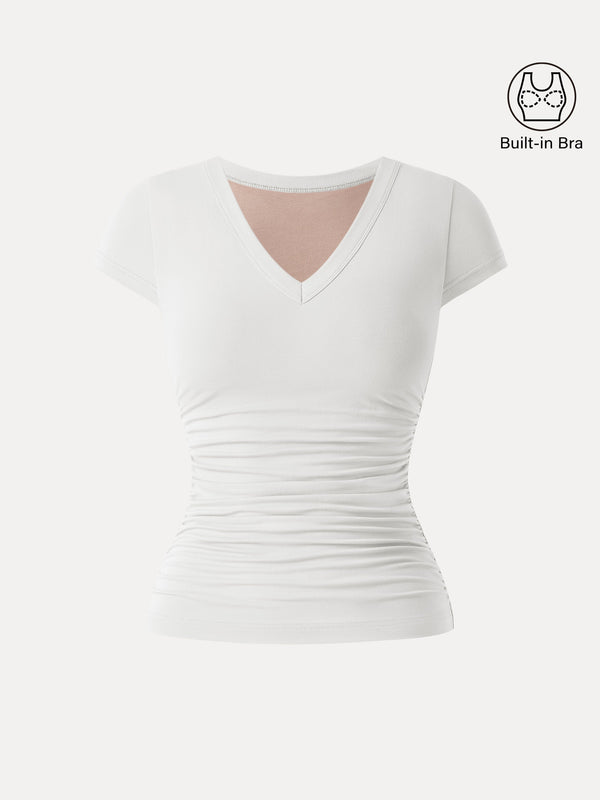 Dieses Slim-Fit-T-Shirt mit V-Ausschnitt, seitlichen Raffungen und weichen Flügelärmeln setzt Ihre Figur perfekt in Szene. Mit den herausnehmbaren BH-Polstern ist es der perfekte Begleiter für Komfort, Form und Selbstvertrauen im Alltag.