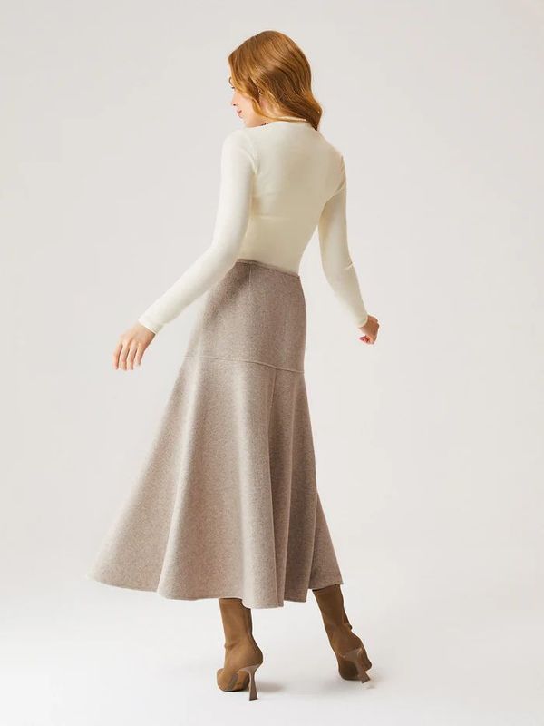 Der ausgestellte Maxirock in Wolloptik ist ein echter Hingucker in Ihrer Garderobe und besticht durch seine schmeichelnde Silhouette, die Ihrem Outfit elegante Bewegung verleiht. Er fällt perfekt, um seine ausgestellte Form zu bewahren. Der unsichtbare Reißverschluss sorgt für ein nahtloses, elegantes Finish, während die Maxilänge ihn sowohl für den Beruf als auch für die Freizeit geeignet macht. Er ist vielseitig einsetzbar und kann als Basis für verschiedene Looks mit Sneakers oder High Heels getragen werden.