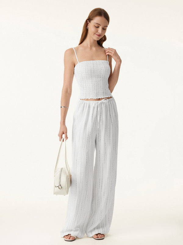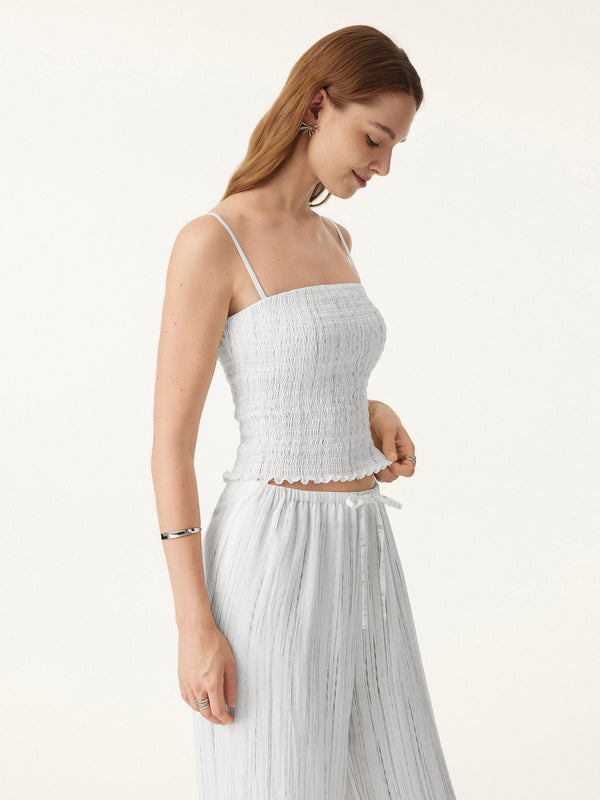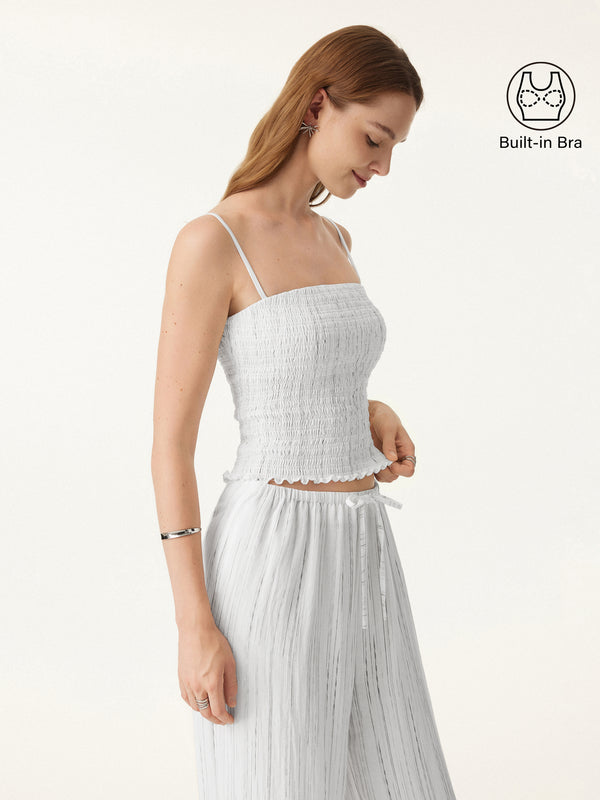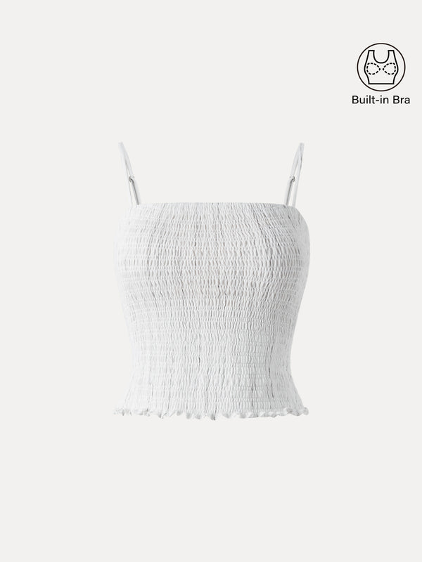 Das Top besticht durch ein gesmoktes Oberteil, das sich angenehm an Ihre Figur anschmiegt, und verstellbare Spaghettiträger für eine individuelle Passform. Mit herausnehmbaren BH-Polstern und klassischen Streifen ist es das perfekte, leichte Piece für warme Tage – unkompliziert, feminin und immer tragbar.