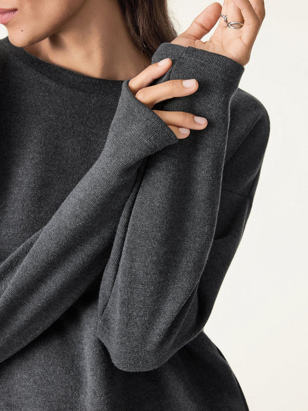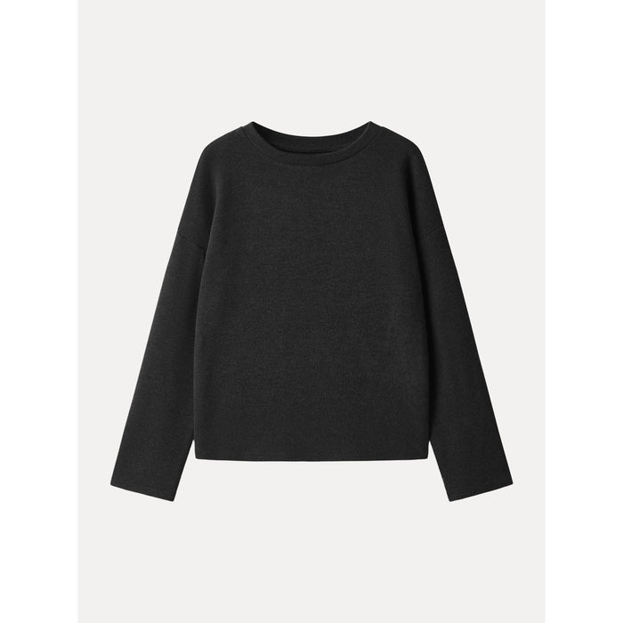 Sie werden dieses kuschelige Oberteil aus strukturiertem, mittelschwerem Stoff lieben, der seine Form behält und sich gleichzeitig weich auf der Haut anfühlt. Die lockere Passform und der Rundhalsausschnitt machen es zu einem bequemen Alltags-Top, perfekt für frische Herbsttage und kühle Morgen.