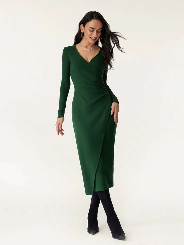 Das Surplice Wrap Midikleid verfügt über einen schmeichelhaften V-Ausschnitt, der Ihr Schlüsselbein umrahmt und Ihren Hals streckt. Der Schnitt ist darauf ausgelegt, Ihre Kurven zu betonen. Der thermisch gebürstete Stoff hält Sie warm, während die weiche, dehnbare Rippe eine bequeme Passform bietet.