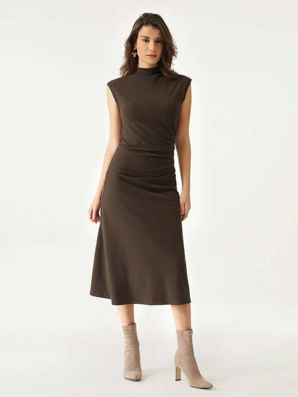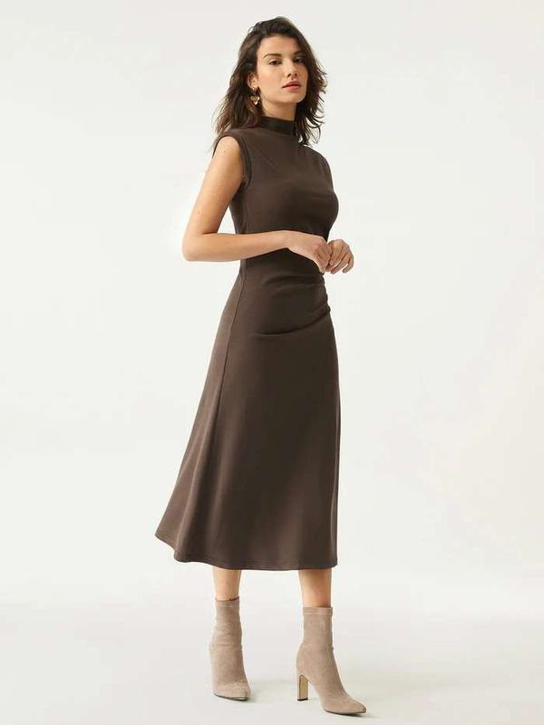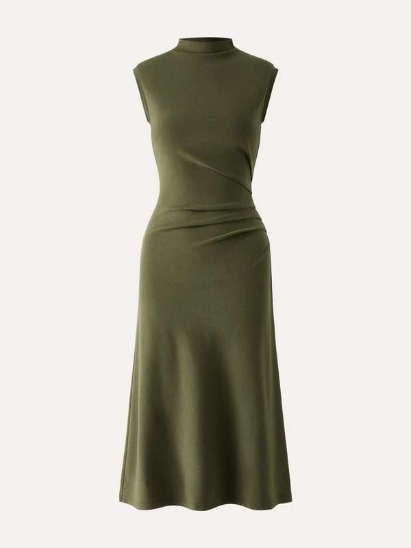 Schlüpfen Sie in ein elegantes, fertiges Outfit mit unserem Stehkragen Midikleid. Ob für die Arbeit oder das Wochenende – dieses Kleid ist bequem und modern elegant. Die schmale Passform, die Midilänge und die Biesendetails an der linken Taille sorgen für eine schmeichelhafte Silhouette, die Ihre natürliche Figur betont, während der Stehkragenk ein raffiniertes Detail verleiht. Wir lieben es, dass Sie es sowohl mit High Heels als auch mit Sneakers tragen können.
