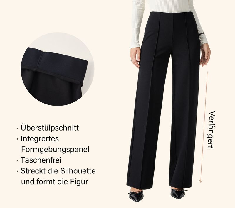 Elegant. Figurformend. Selbstbewusst. Diese mittelhoch geschnittene, lange Hose mit integriertem Bauchweg-Einsatz bietet höchsten Tragekomfort und formt Ihre Taille auf natürliche Weise. Dank des Verzichts auf Taschen wirkt die klare Linie besonders dezent und verleiht Ihnen mühelos eine elegante Supermodel-Ausstrahlung.