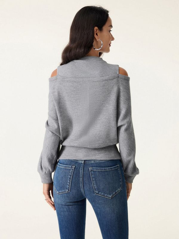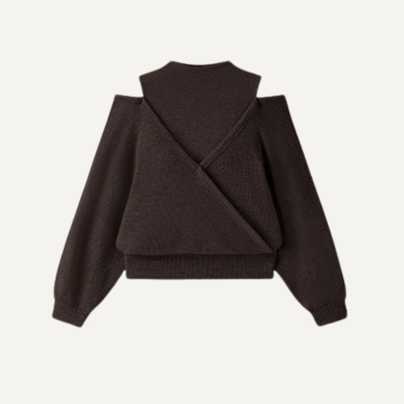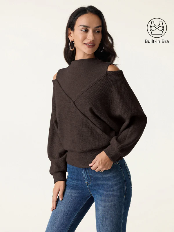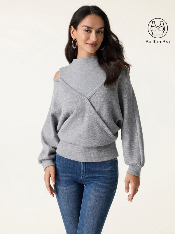 Dieses einzigartige Stricktop wird Sie begeistern: Es vereint einen eleganten Stehkragen mit einer raffinierten Wickeloptik und einem Cut-out an den Schultern. Der gerippte Saum und die Bündchen verleihen ihm einen edlen Look, während herausnehmbare BH-Einlagen für Komfort und Halt sorgen.