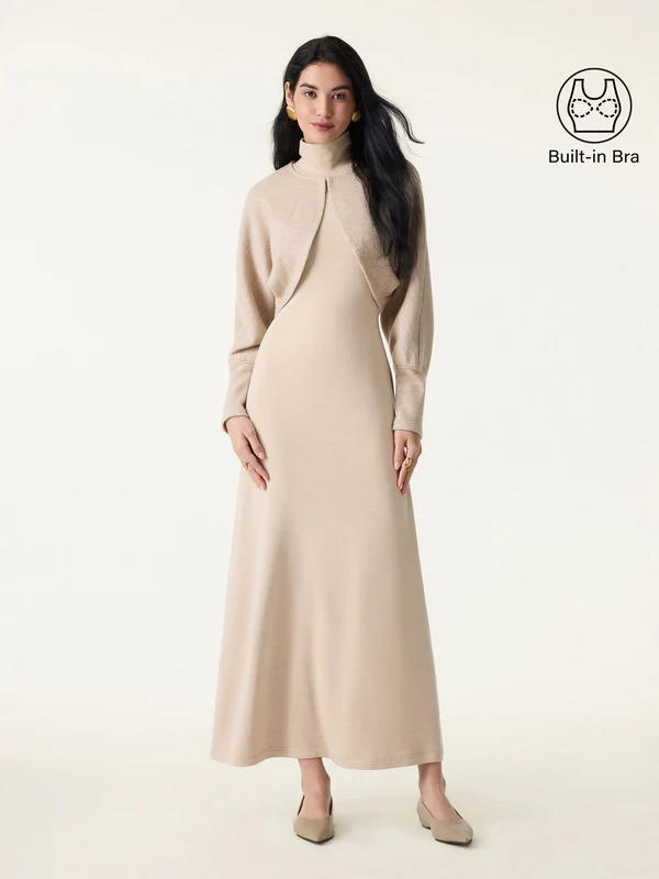 Dieses figurbetonte, zweiteilige Kleiderset wird Sie begeistern: ein elegantes, ärmelloses Rollkragenkleid und eine passende Strickjacke sorgen für einen raffinierten Lagenlook. Das Set ist mit einem Hakenverschluss und Bündchen versehen und verfügt über herausnehmbare BH-Einlagen für optimalen Tragekomfort und Halt.