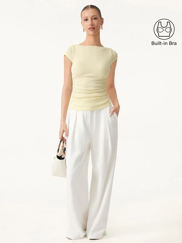 Das Top reicht bis zur Hüfte und verfügt über einen schlanken U-Boot-Ausschnitt, ein Bustier-inspiriertes Design und Flügelärmel für einen sanft strukturierten Look. Geraffte Seiten betonen Ihre Figur, während herausnehmbare BH-Polster für Komfort und Halt sorgen.