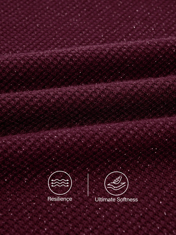 Die pulloverartige Textur und der zarte Hauch von Lametta verleihen dem Pullover einen festlichen und auffälligen Look. Der Stoff besticht durch das vertraute, kuschelige, weiche Tragegefühl klassischer Strickwaren, aber mit einem zusätzlichen Glanz, der die Weihnachtsstimmung einfängt.
