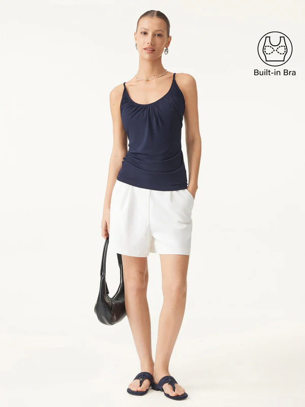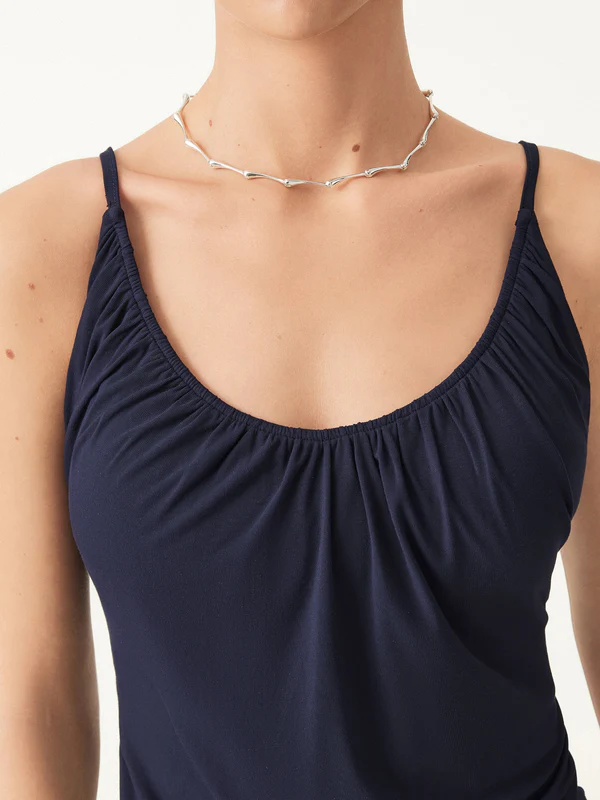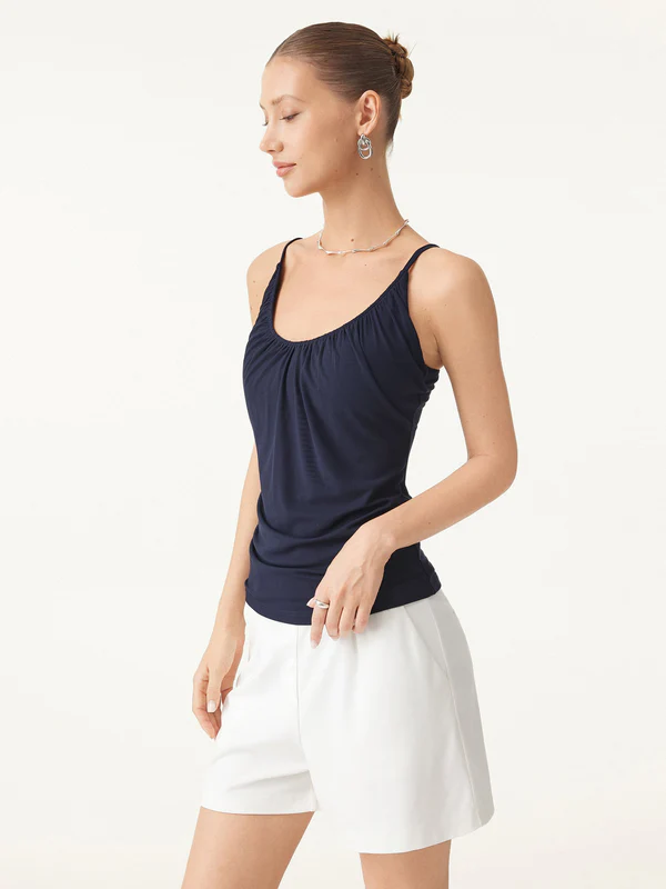 Ein schmeichelhaftes Alltagsmodell mit einem weichen, femininen Griff. Der Ausschnitt wird durch zarte Raffungen auf der Vorderseite betont, während die verstellbaren Spaghettiträger für eine perfekte Passform sorgen. Dank der herausnehmbaren BH-Polster lässt es sich leicht und mühelos mit allem kombinieren.