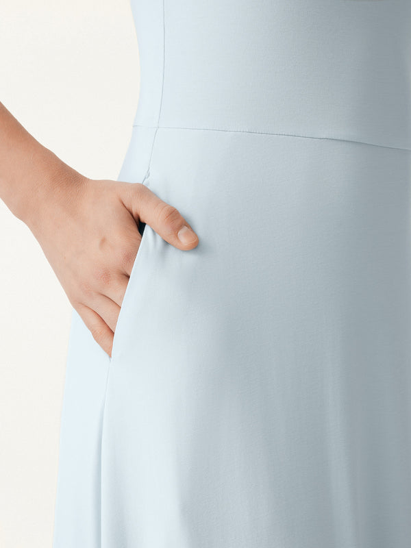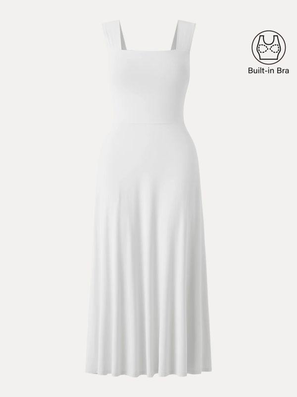 Klare Linien, entspannte Sommerstimmung. Dieses schmal geschnittene Midikleid mit eckigem Ausschnitt und breiten Trägern sorgt für einen schmeichelhaften, strukturierten Look. Mit Taschen und herausnehmbaren BH-Polstern ist es das perfekte Kleidungsstück für kühlen Tragekomfort.