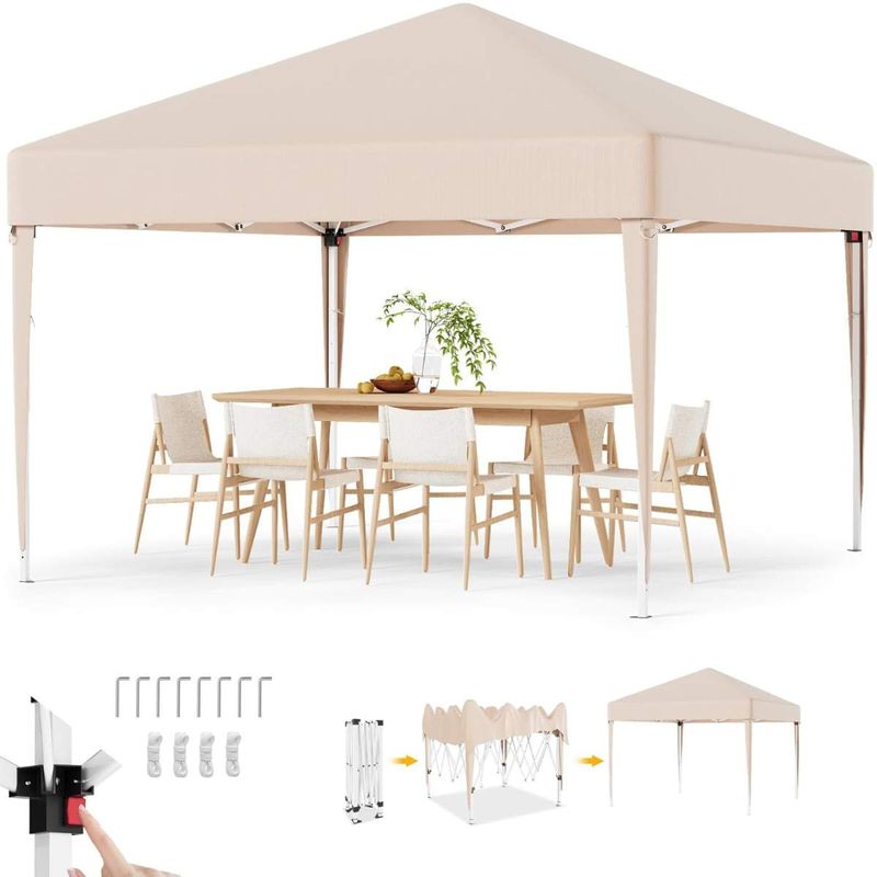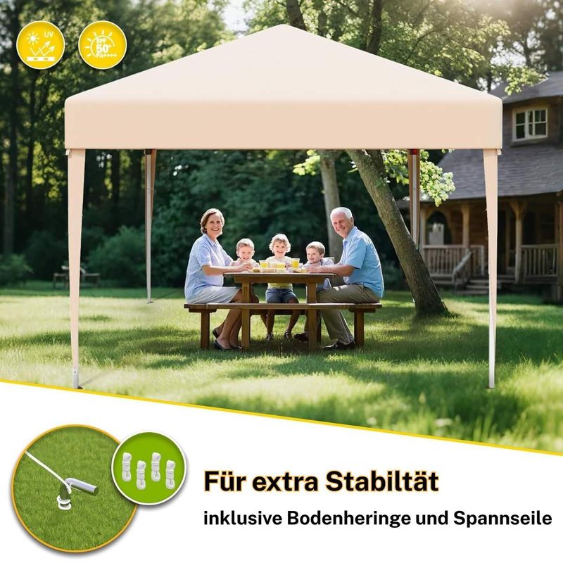 Dieser faltbare Pavillon mit einer Größe von 3 x 3 m bietet Ihnen zuverlässigen Schutz bei verschiedensten Outdoor-Anlässen. Das Dach aus hochwertigem 210D Oxford-Gewebe mit PVC-Beschichtung ist wasserfest und verfügt über einen UV-Schutz von 50+, sodass Sie und Ihre Gäste optimal vor Sonne und Regen geschützt sind. Das stabile Metallgestell ist rostbeständig und sorgt in Kombination mit den mitgelieferten Metallheringen und Spannseilen für einen sicheren Stand. Dank des durchdachten Faltmechanismus lässt sich der Pavillon werkzeuglos und in wenigen Minuten aufbauen. Mit einem geringen Gewicht sowie der praktischen Tragetasche ist er zudem leicht zu transportieren und flexibel einsetzbar. Die dreifach verstellbare Höhe ermöglicht eine individuelle Anpassung an den Anlass. Ob für Gartenfeste, Märkte oder Camping – dieser Pavillon ist eine praktische und vielseitige Lösung für den Außenbereich.