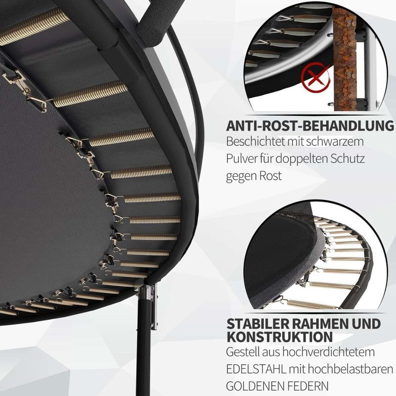 Der stabile Rahmen und die Beine schützen zuverlässig vor Rost. Mit einem Gesamtdurchmesser von 2,44 m bietet dieses runde Trampolin jede Menge Springspaß.