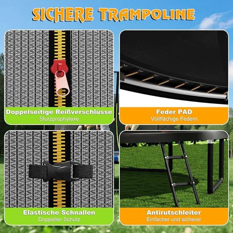 Die UV-beständige Polypropylen-Sprungmatte bietet Elastizität und Widerstandsfähigkeit gegen Abnutzung. Mit einem robusten PET-Sicherheitsnetz ist das hochwertige Trampolin langlebig und wetterfest und sorgt für die Sicherheit Ihrer Kinder beim Springen. Um auch Belastungen von bis zu 100 kg standzuhalten, hat das Trampolin vestärkte W-Beine mit hoher Dichte aus vollverzinktem Schwerlaststahl und gebogenen Sicherheitsstangen, die das Verletzungsrisiko deutlich reduzieren. Dazu ermöglicht die Einstiegsleiter auch kleineren Kindern einen bequemen Zugang. In der seitlichen Tasche können Schuhe und Spielzeuge verstaut werden, sodass sie nach dem Toben schnell wieder greifbar sind.